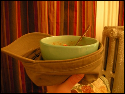 I made chili tonight (recipe forthcoming!), and with that came my old college (so weird saying “college” in terms of the past) practice of eating soup out of bowls out of hats. Since we (my roommates and I) never had any kind of table to eat on, I had to hold it and eat. (Eating at my desk instead of in front of the TV was just silly, and you shouldn’t have even brought it up.) So, I put the bowl in my hat. Kept my hands nice and un-burnt.